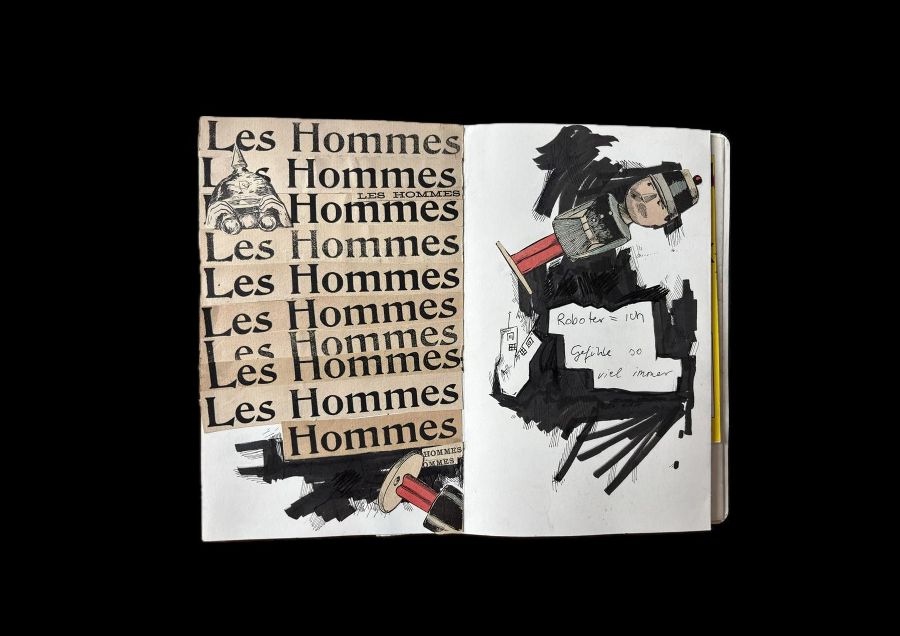 Katharina Roher beschäftigt sich in ihrer Arbeit Roboter=ich (Gefühle so viel immer) mit der Idee eines Transformationsprozesses zu einem humanoiden Roboter. Eine auf Fundobjekten und Keramik basierende Skulptur wird installativ ergänzt von einer Sammlung aus Skizzen und Collagen. Angelehnt an das Konzept des Kokons als Zustand zwischen Auflösung und Neubeginn, ebenso wie an Ideen der Entmenschlichung, erkundet Katharina visuell wie konzeptuell das Spannungsfeld von Natur und Künstlichkeit. Zentral ist dabei das Konzept emotionaler Last und Belastbarkeit. So bleibt die Frage offen: „Wer oder was bin ich, wenn ich nicht mehr fühle?"